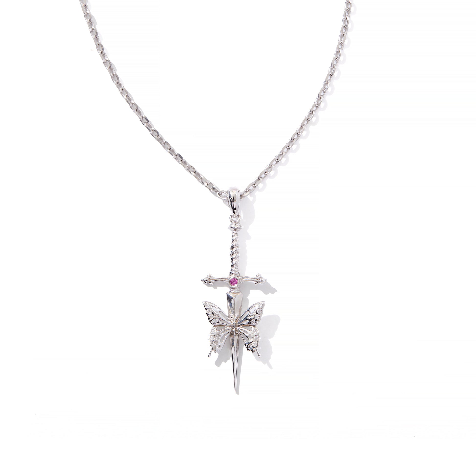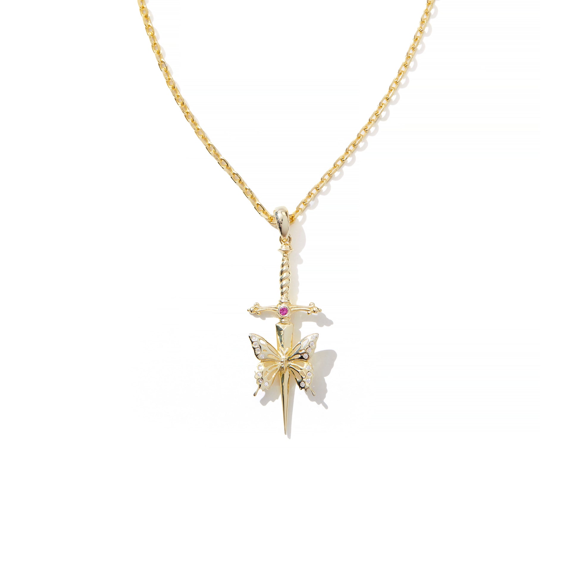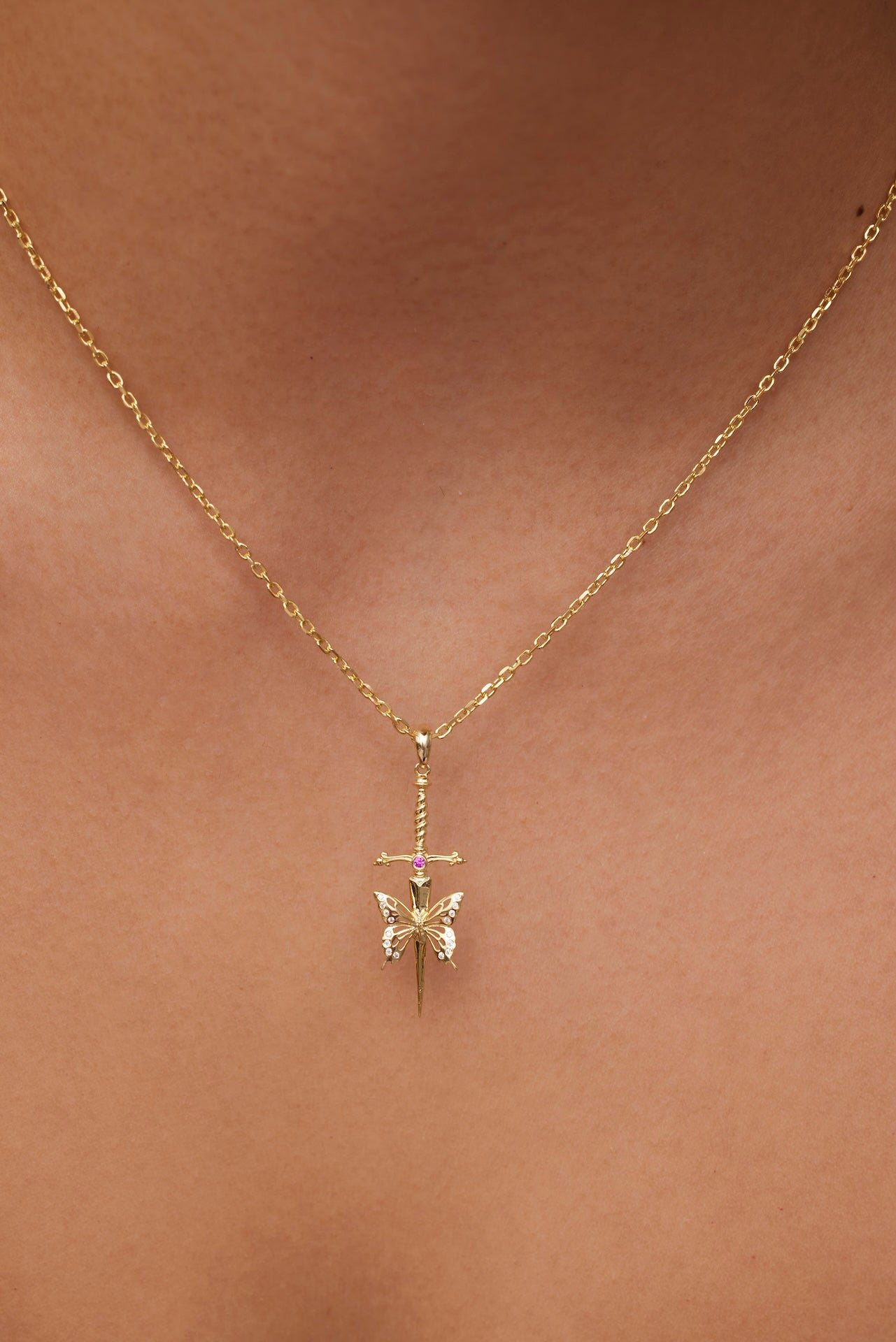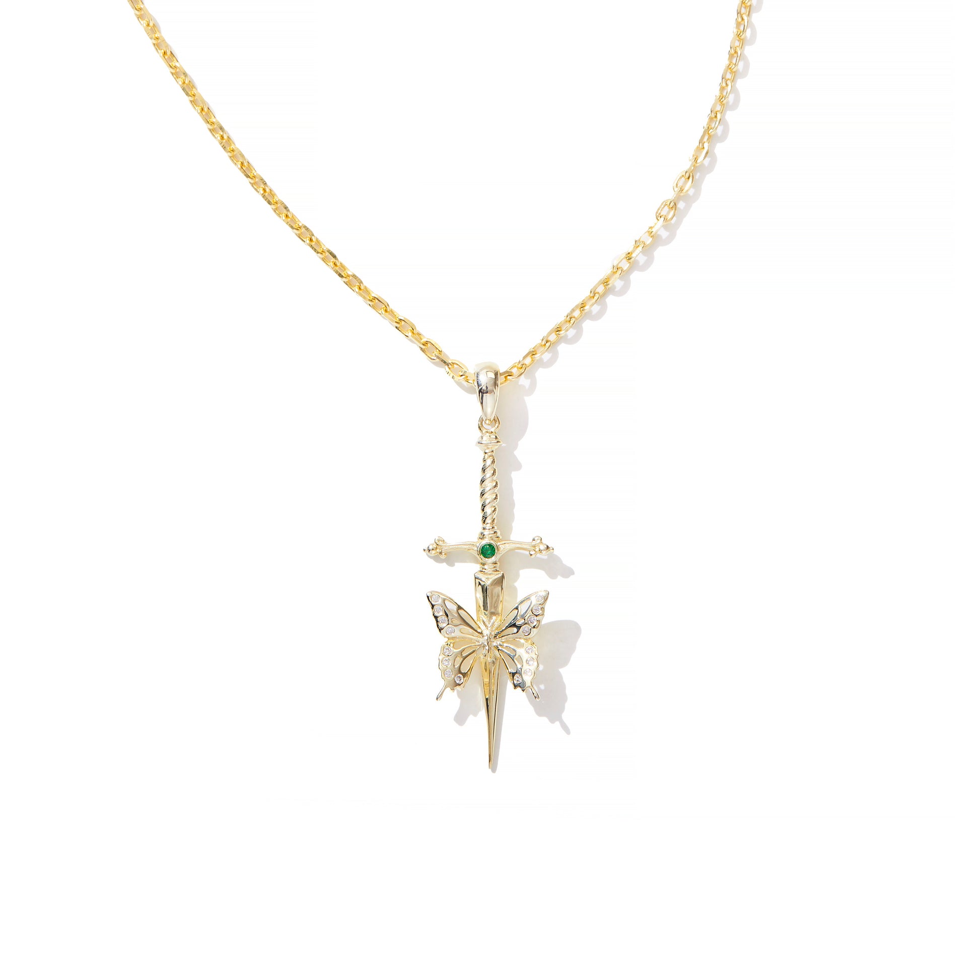 For you and yours. A delicate necklace with a butterfly and dagger pendant and green or pink cubic zirconia. Made of 14k Gold Vermeil.