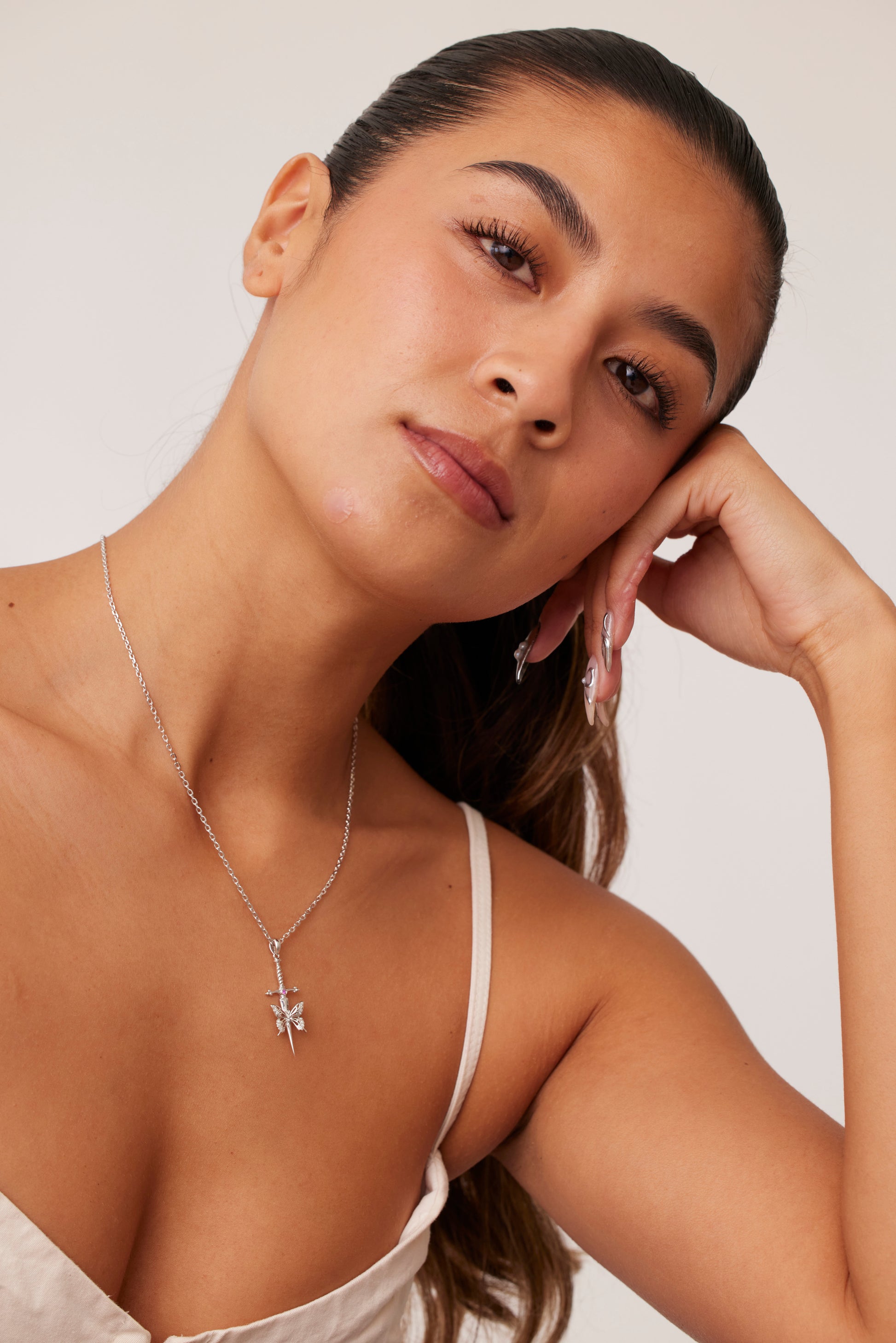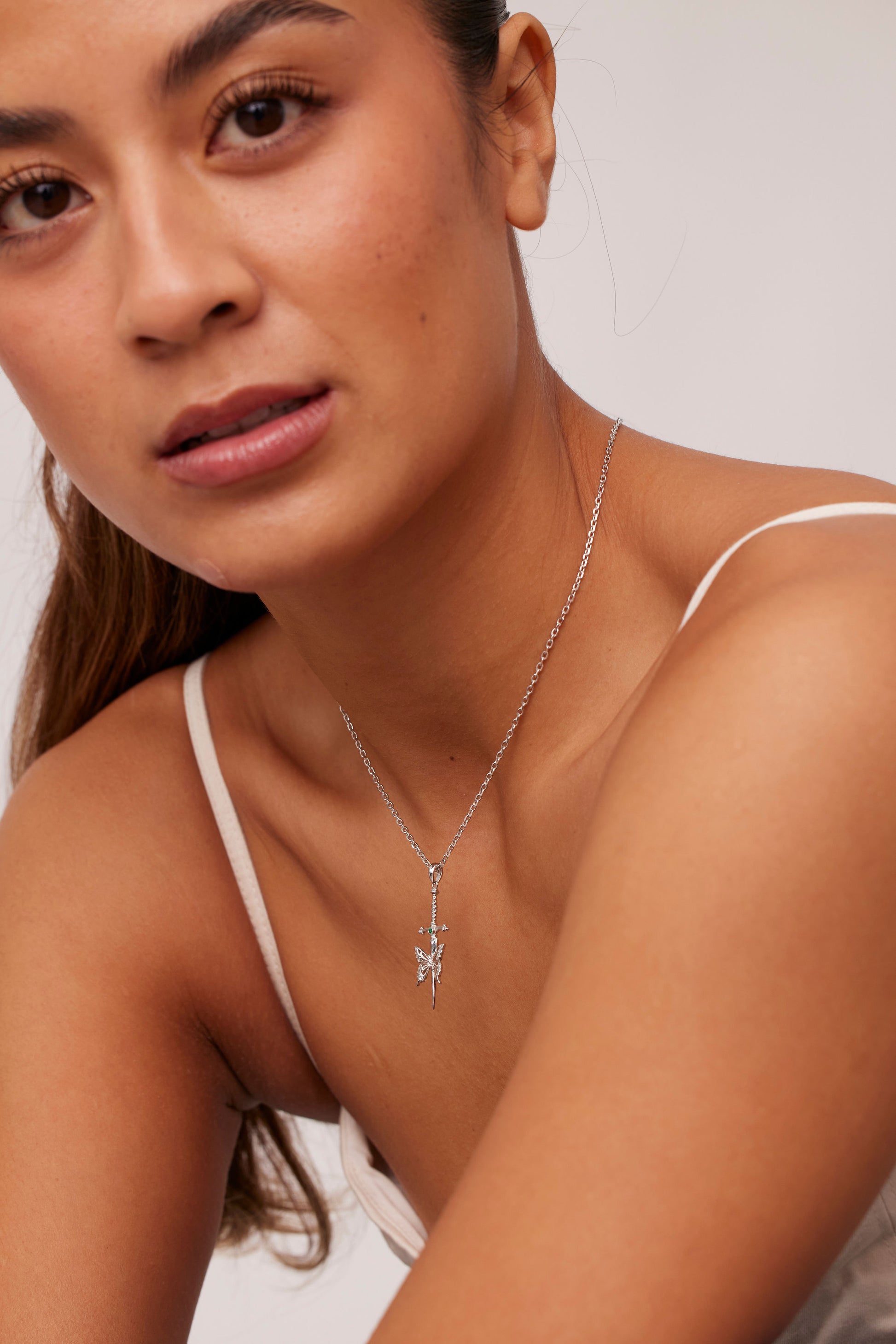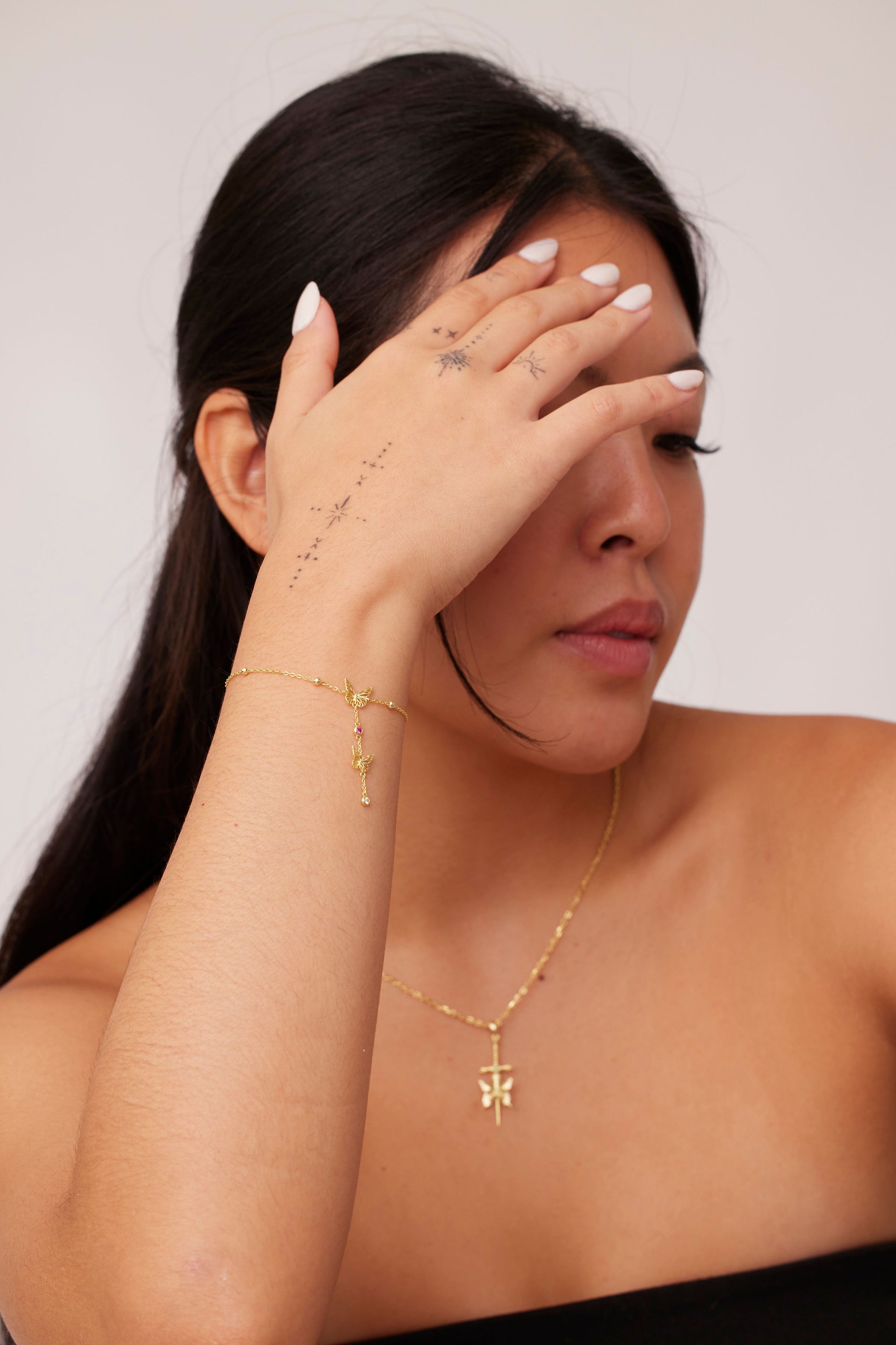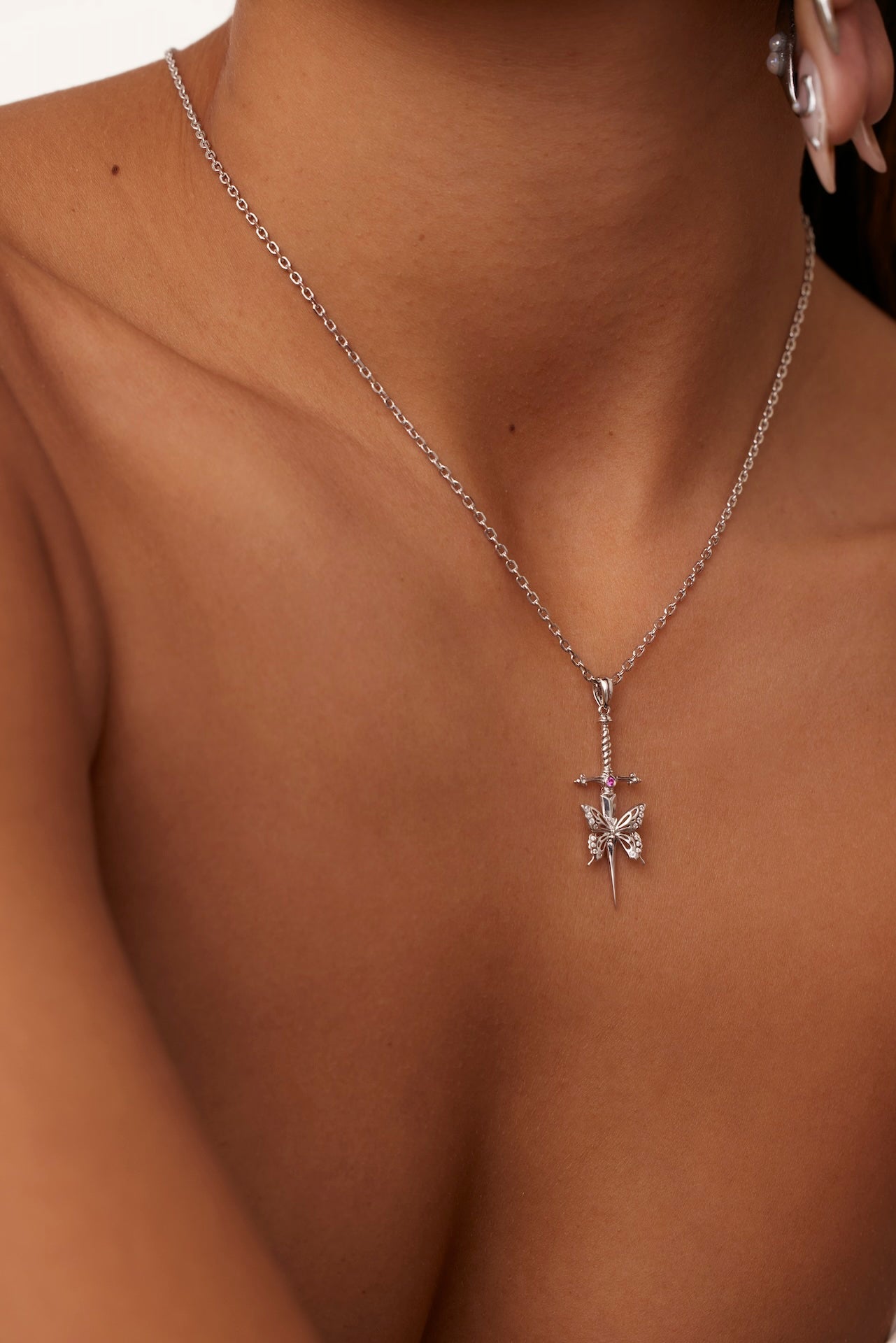 For you and yours. A delicate necklace with a butterfly and dagger pendant and green or pink cubic zirconia. Made of 14k Gold Vermeil.