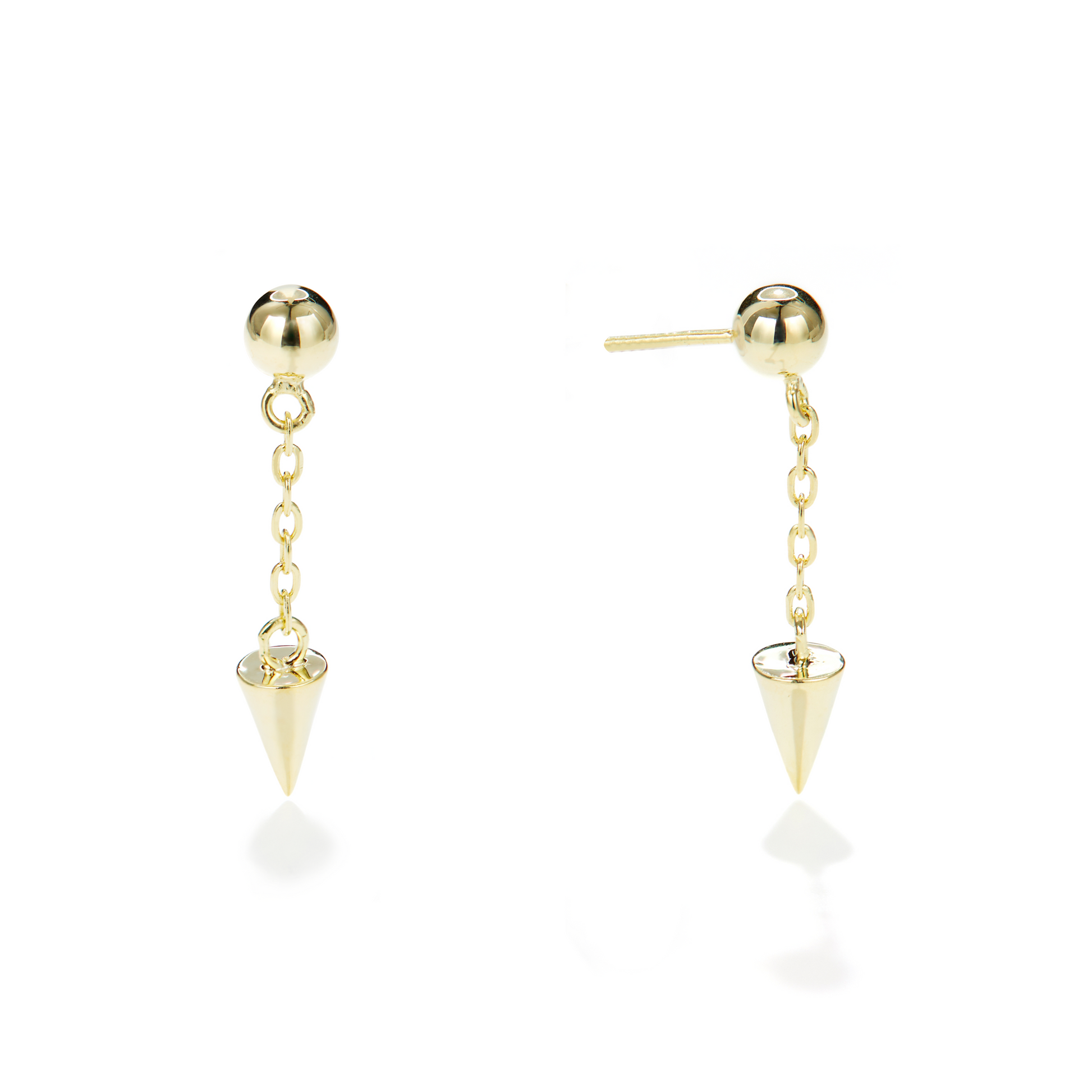 A 14k gold ball end, delicate dangle chain with a solid gold spike drop charm to keep things interesting. It is available in 4mm (3mm x 11mm) and 7mm (3mm x 18.5mm) and is available in 14k Yellow, Rose and White gold.
