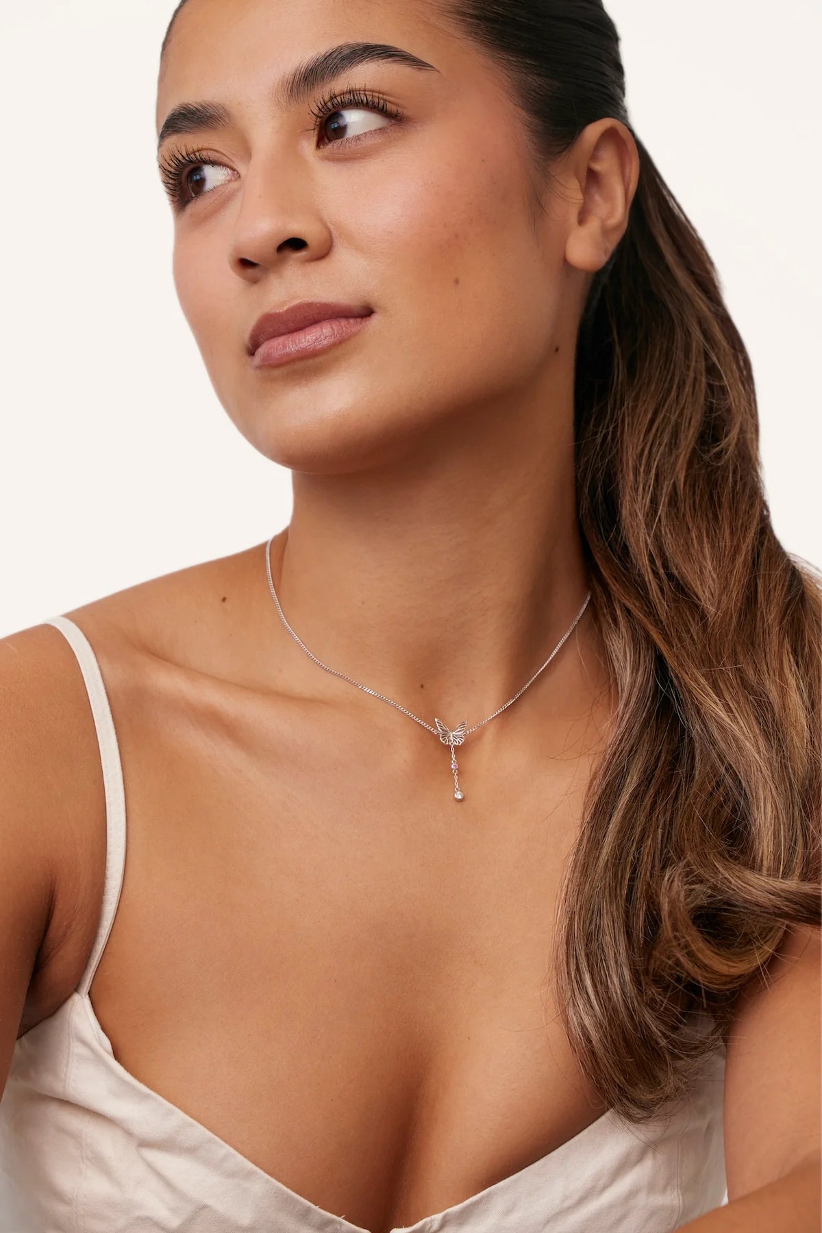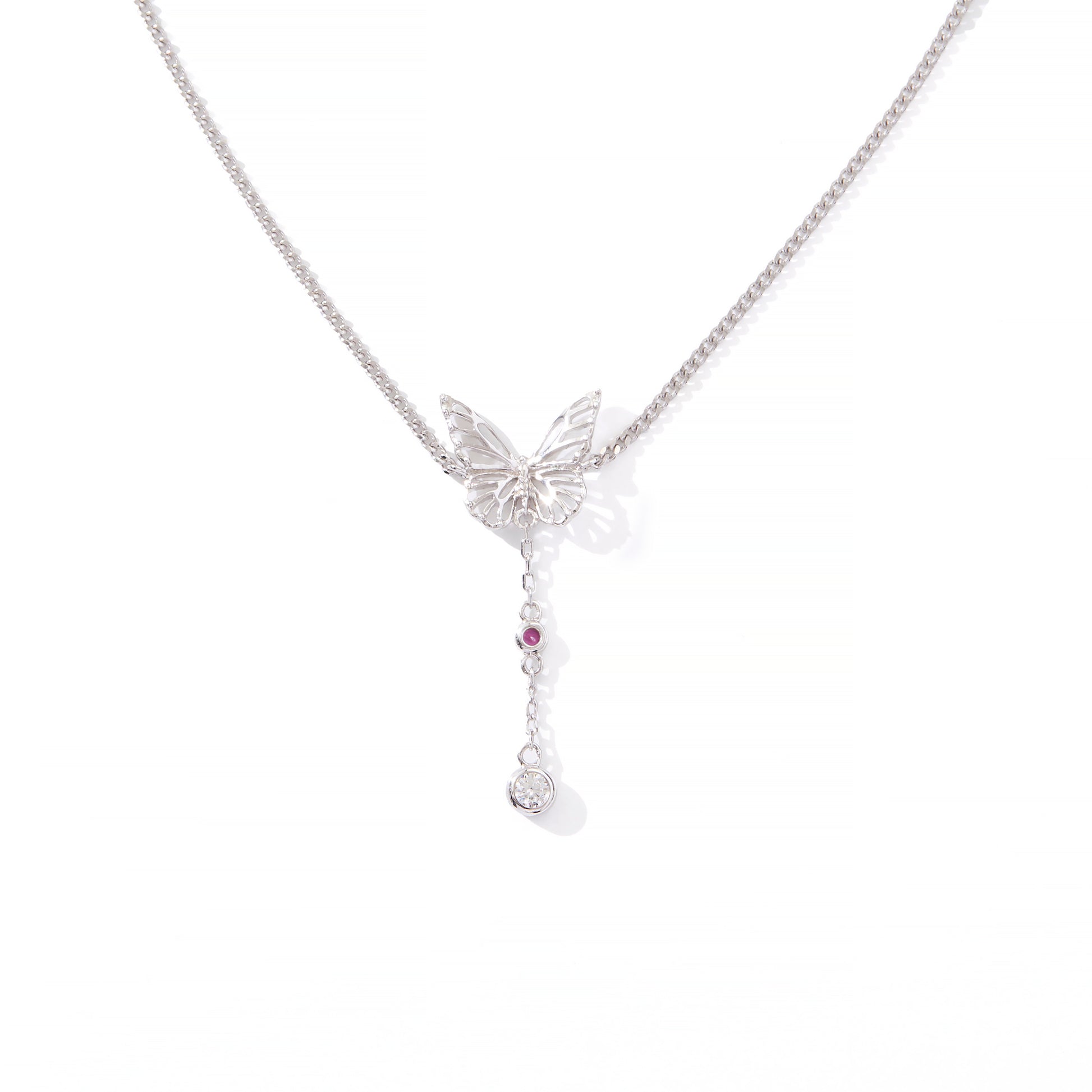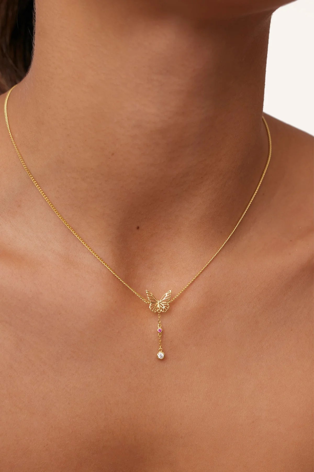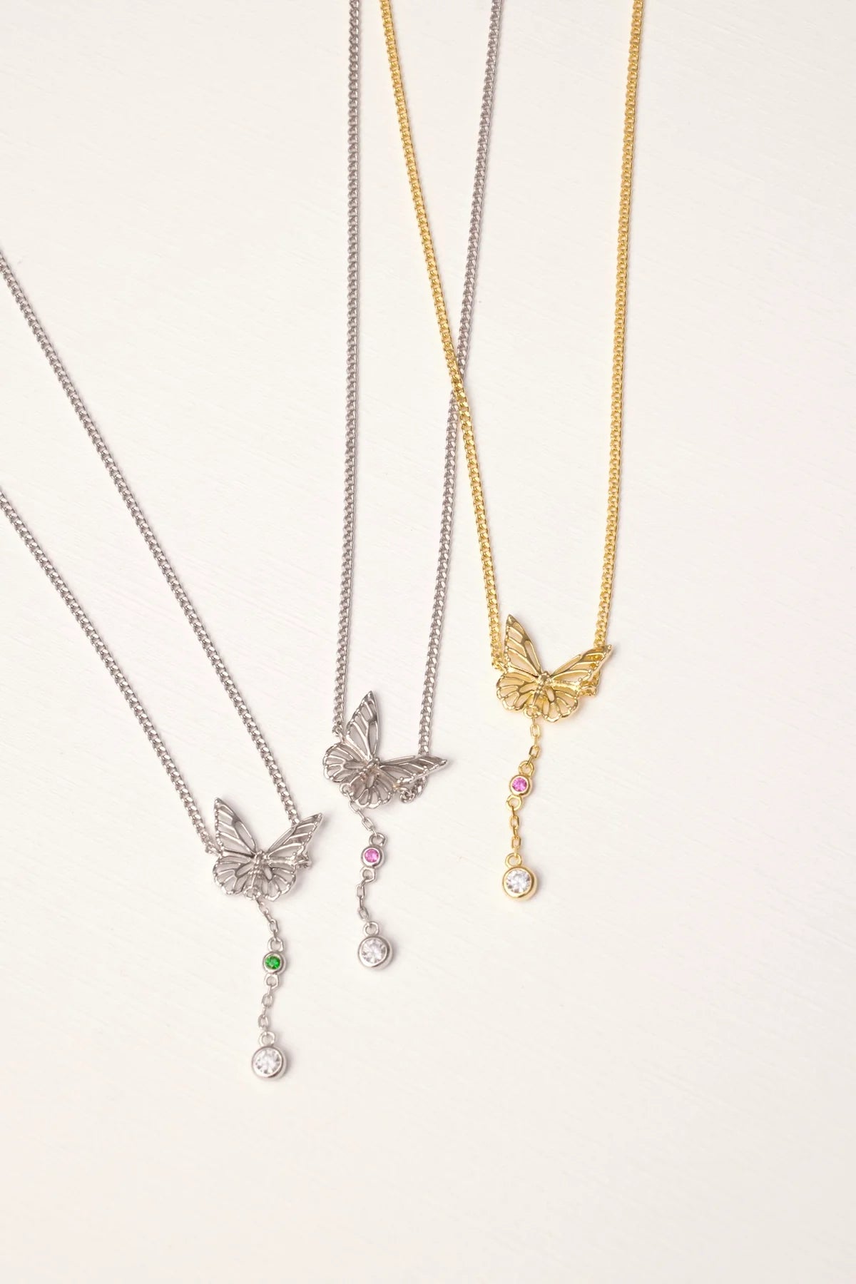 For you and yours. A chain necklace with a dangling chain, butterfly pendant, and green or pink cubic zirconia. Made of 14k Gold Vermeil.